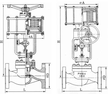 配用附件:電磁閥、閥位回訊器、空氣過濾減壓器、手輪操作機構外形尺寸