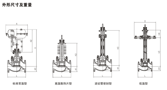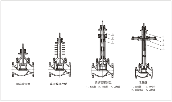 | 系列類型 | 常溫型、中溫型、低溫型。波紋管密封型、夾套保溫型、調節切斷型 | ||||||||||||||||||||||||||||